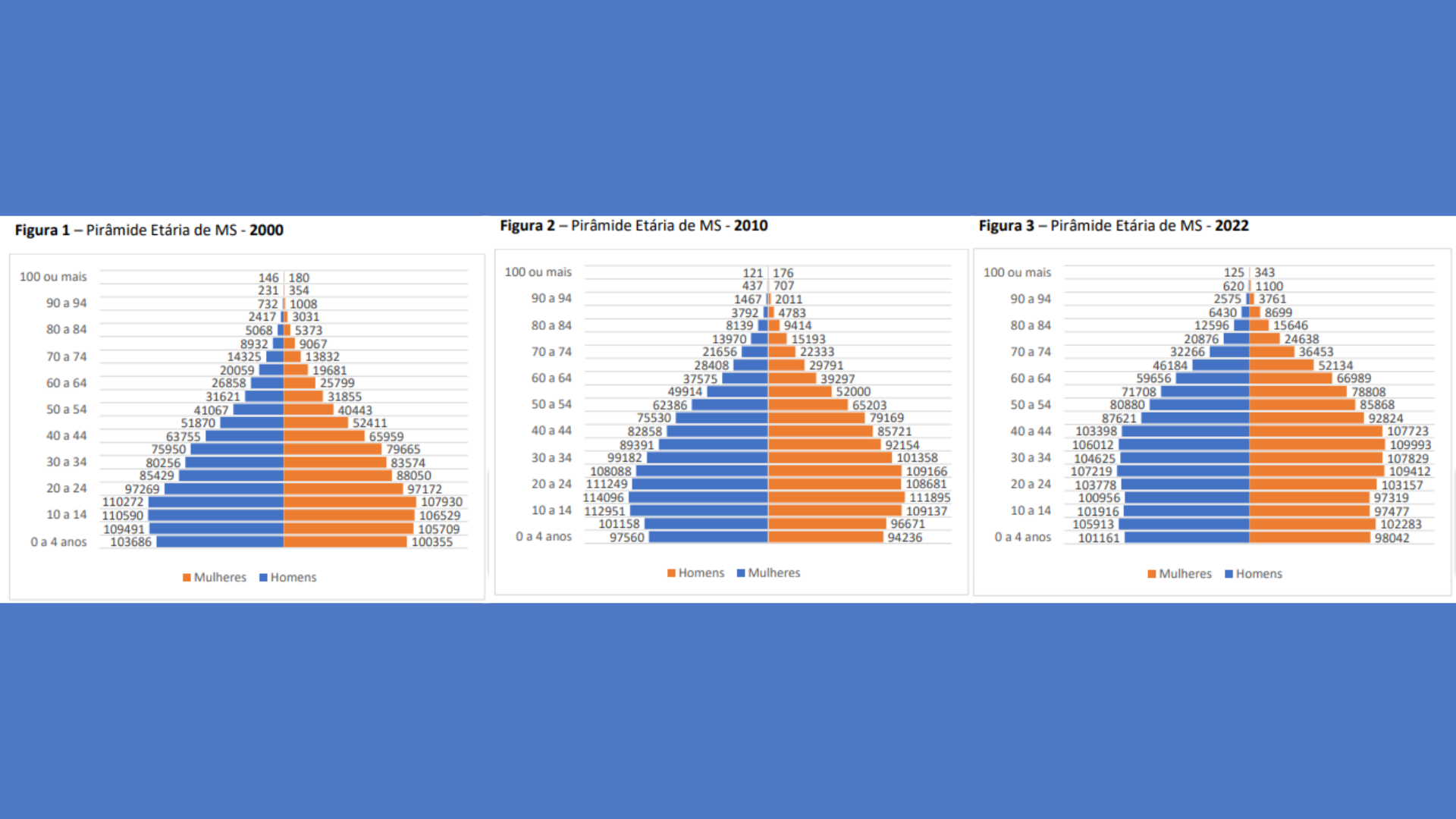 As figuras 1, 2 e 3 mostram as pirâmides de MS construídas com os resultados dos Censos 2000, 2010 e 2022. Reprodução IBGEEm Mato Grosso do Sul, no primeiro Censo após a divisão do estado (1980), o grupo de crianças de 0 a 14 anos representava 40,8% da população.