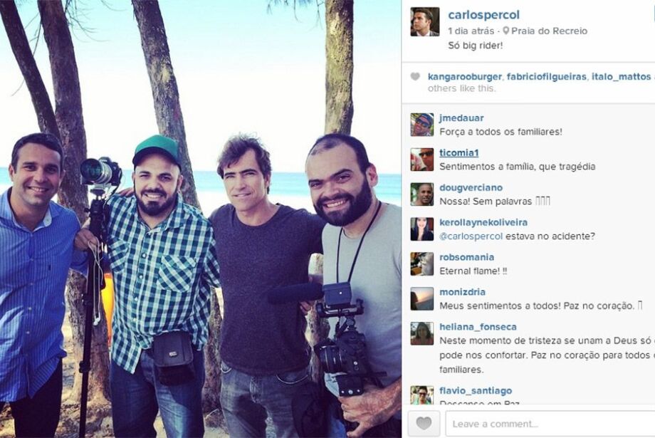 Na imagem, Percol, o cinegrafista Marcelo Lyra e o fotógrafo Alexandre Severo estão na praia do Recreio, no Rio de Janeiro, ao lado do surfista Carlos Burle, com quem fizeram gravações em vídeo para a campanha. Nas redes sociais, o surfista lamentou a tragédia: