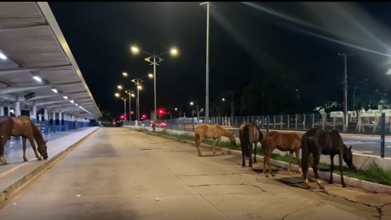 Uma cena inusitada chamou atenção, na madrugada desta segunda-feira (22), em Campo Grande: seis cavalos foram recolhidos para dentro do Terminal Guaicurus após serem flagrados perambulando pela região.