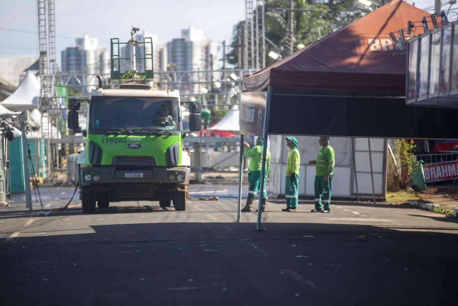 Equipe de 12 empregados da Solurb em um caminhão limpam e organizam o quadrilátero da Esplanada Ferroviária, na manhã desta terça-feira (4), para o último dia de Carnaval.