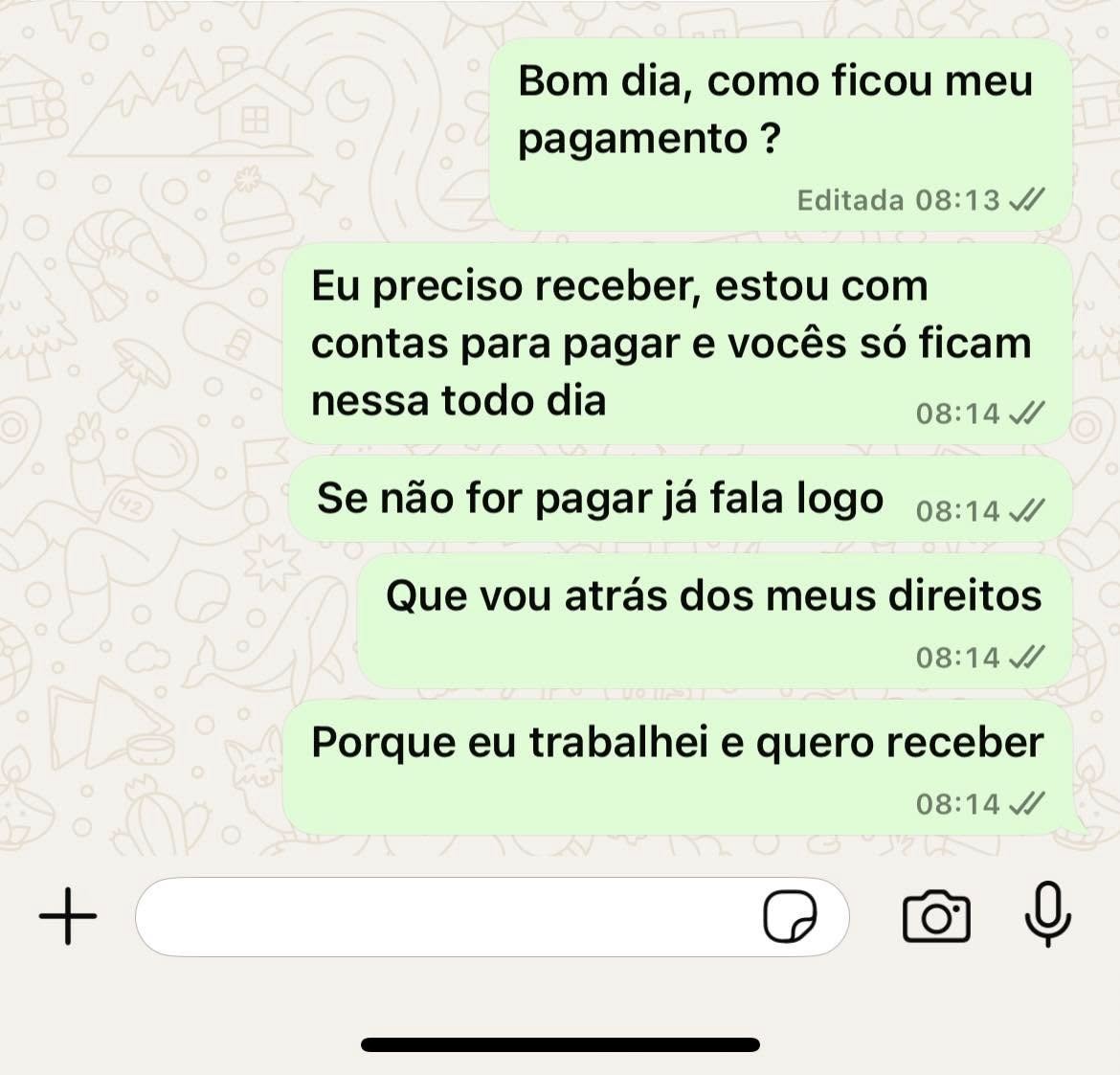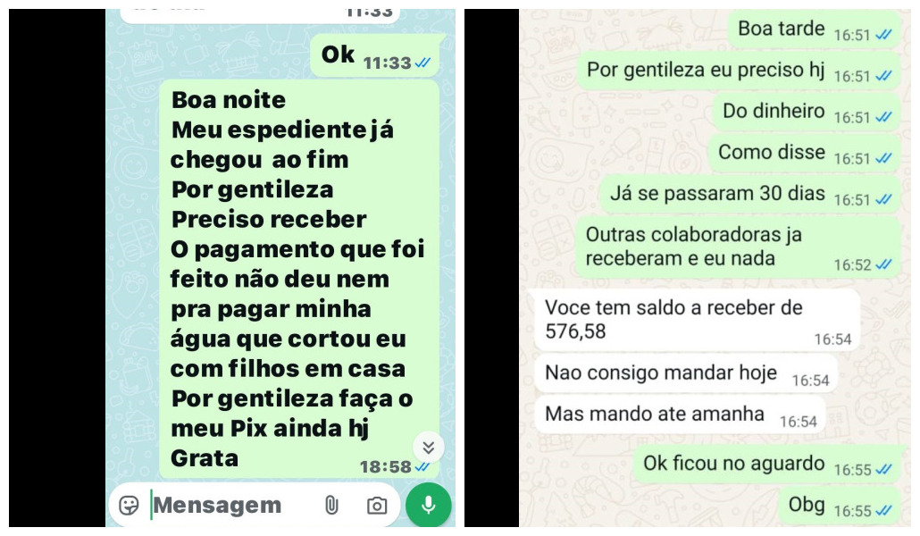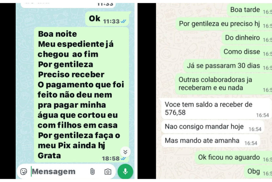 A moça também publicou prints de conversas que teve com a responsável pelos pagamentos dos profissionais, no qual ficou claro que foi ignorada em diversas mensagens, e até o dia 26 de junho, data da publicação da reclamação ainda não havia recebido. "Eu fui trabalhar todos os dias, no sol, na chuva, no frio, gastava gasolina e estou sem receber", contou.