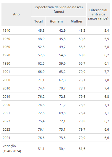 Isso mostra uma diferença de 6,6 anos de expectativa entre os sexos.
