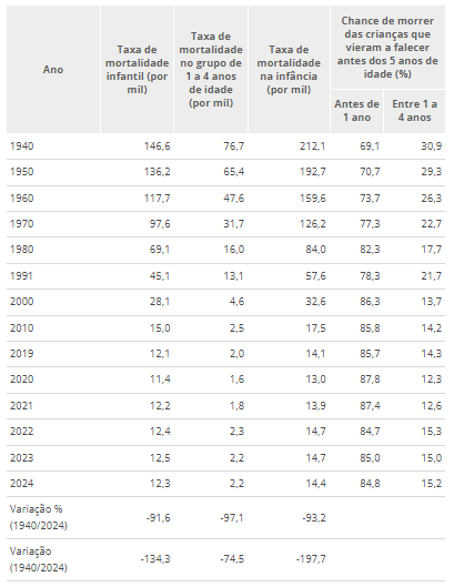 A média brasileira em 2024 era de 12,3 para cada mil crianças nascidas vivas. Esse indicador reduziu de forma drástica desde 1940, quando era de 146,6 crianças que não completariam o primeiro ano de vida a cada mil nascidos vivos.