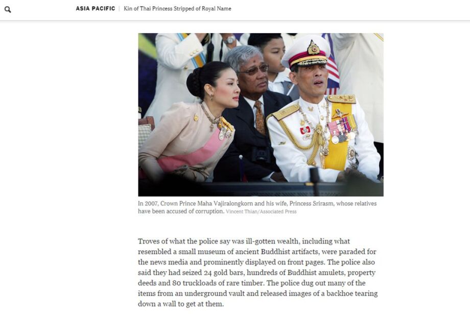 Há alguns dias, o príncipe herdeiro Maha Vajiralongkorn, 62 anos, retirou dos parentes de sua mulher, Srirasmi, o nome real que havia sido atribuído: Akkharapongpricha, uma espécie de título concedido a parentes e primos da realeza. O ato, em suma, retira a condição real dos parentes de Srirasmi.