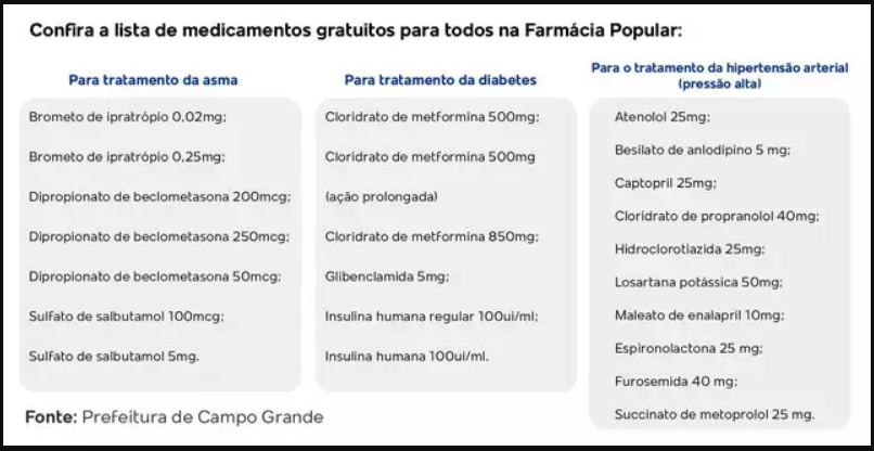 Em Campo Grande, são quase 100 farmácias credenciadas oferecem gratuitamente os mais de 40 medicamentos disponíveis pelo programa, para 11 patologias. Dentre elas, estão: a diabetes, hipertensão, asma, osteoporose e Parkinson.