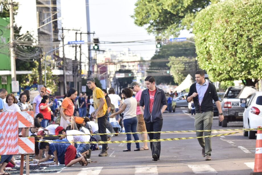 A decoração do tradicional tapete de Corpus Christi começou bem cedo, nesta quinta-feira (20), na Rua Antonio Maria Coelho, região central de Campo Grande. Grupos de 48 paróquias católicas trabalham para deixar pronto, o caminho da procissão realizada no período da tarde.