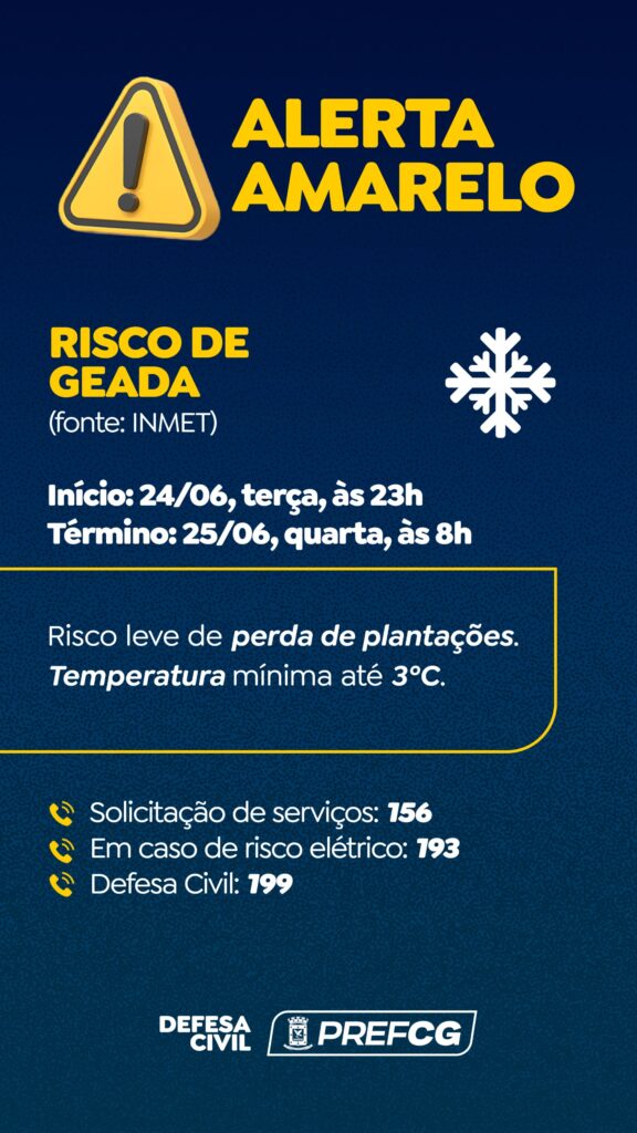 O frio continua em Mato Grosso do Sul e deve ser intenso na madrugada desta quarta-feira (25). A Defesa Civil Municipal de Campo Grande divulgou alerta, emitido pelo Instituto Nacional de Meteorologia (Inmet), de perigo potencial para o risco de geada na Capital.
