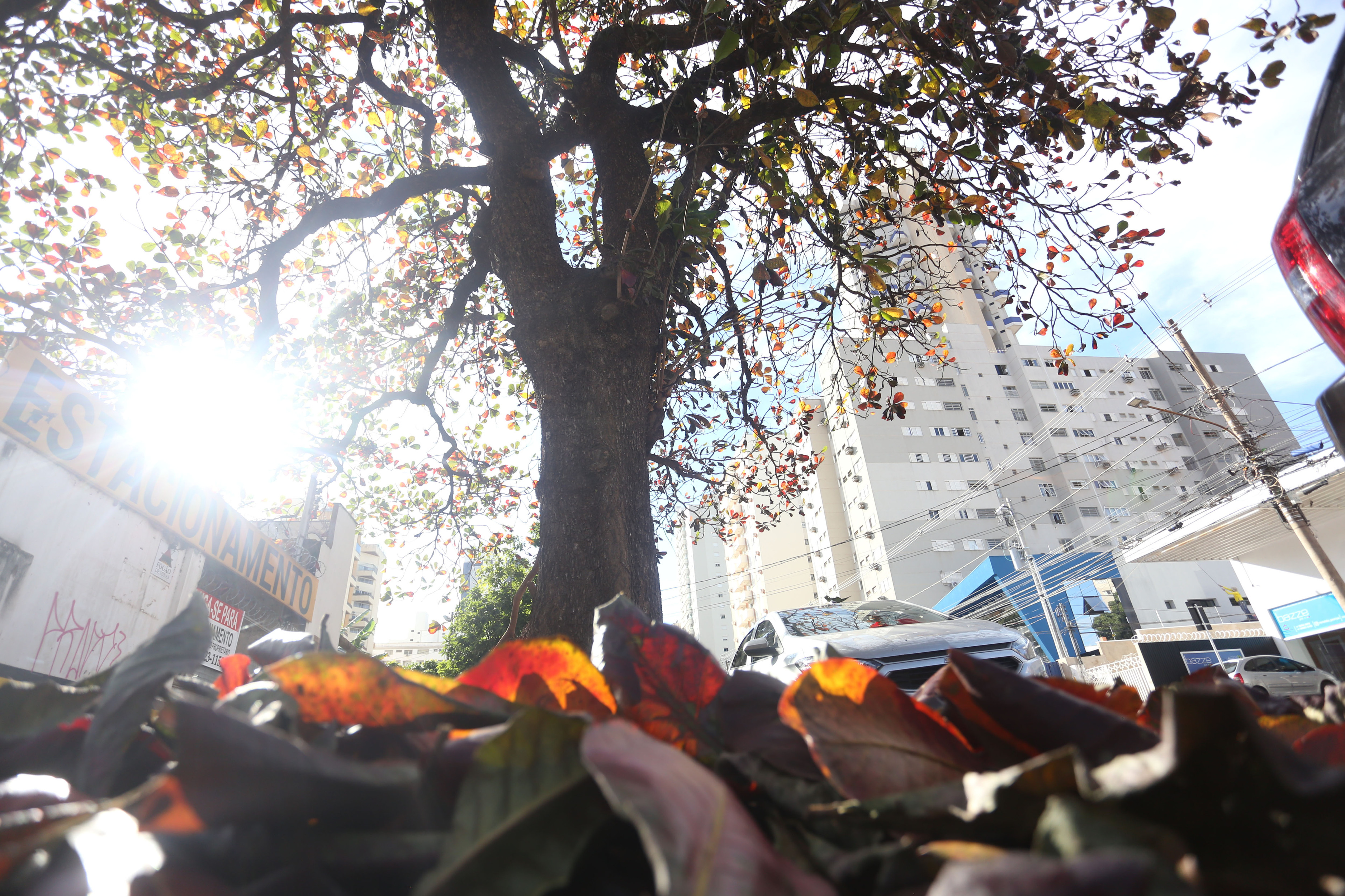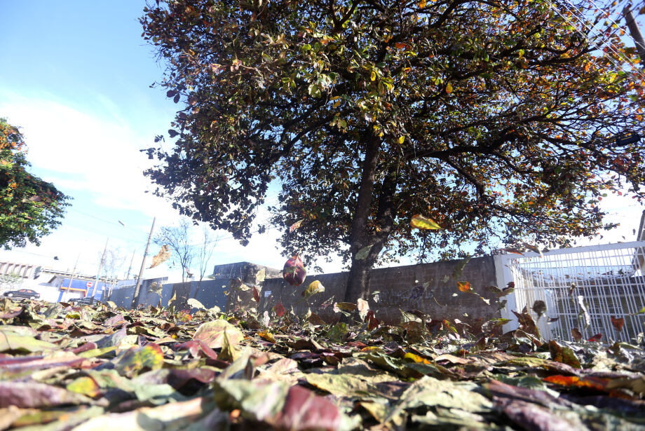 Após o frio rigoroso da semana anterior, algumas ruas de Campo Grande estão forradas de folhas. As temperaturas que chegaram a cerca 4ºC foram embora com a chuva, deixando dias de céu azul límpido como um cristal, tempo seco e muitas árvores perdendo folhas pelo chão.