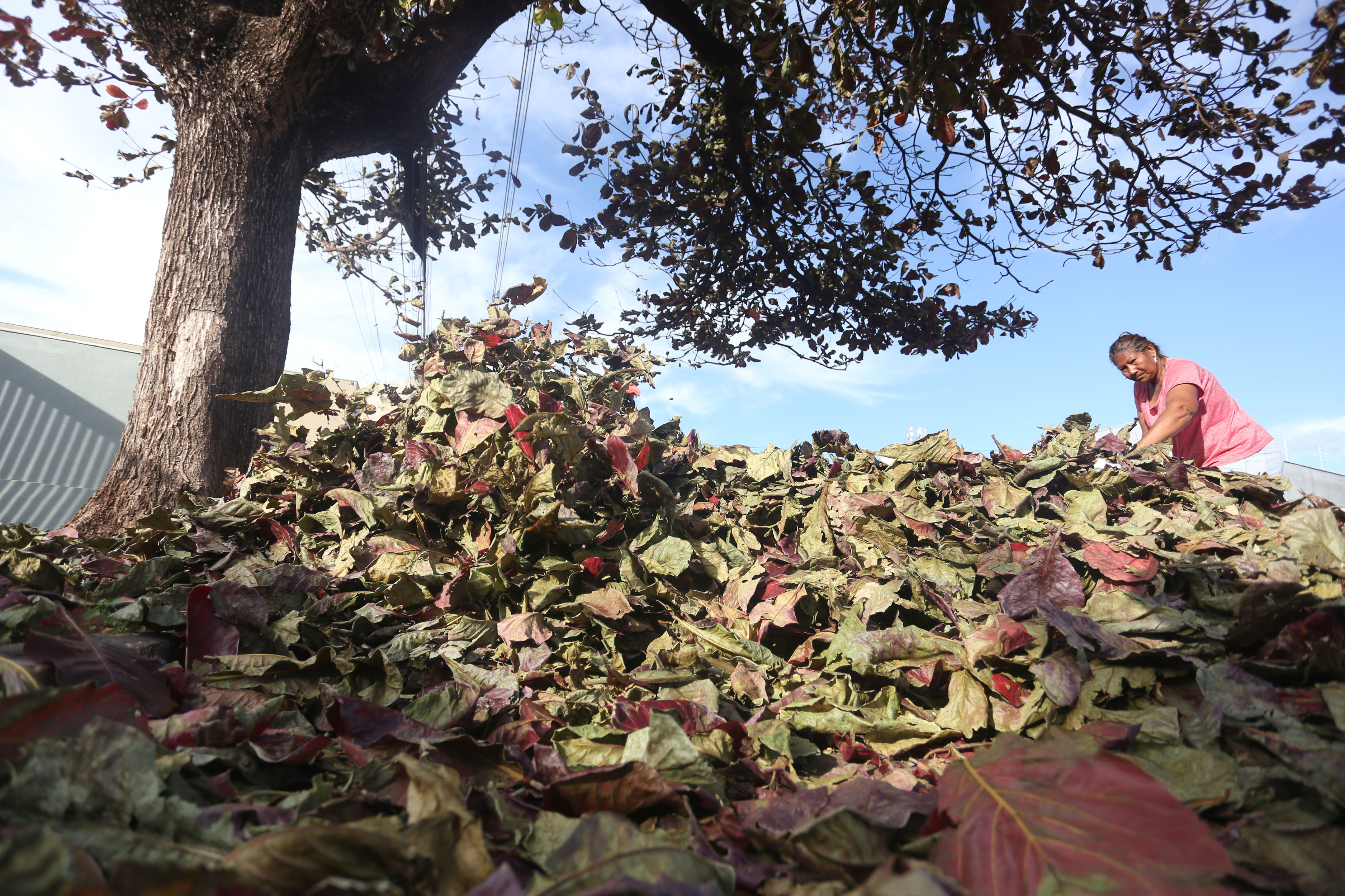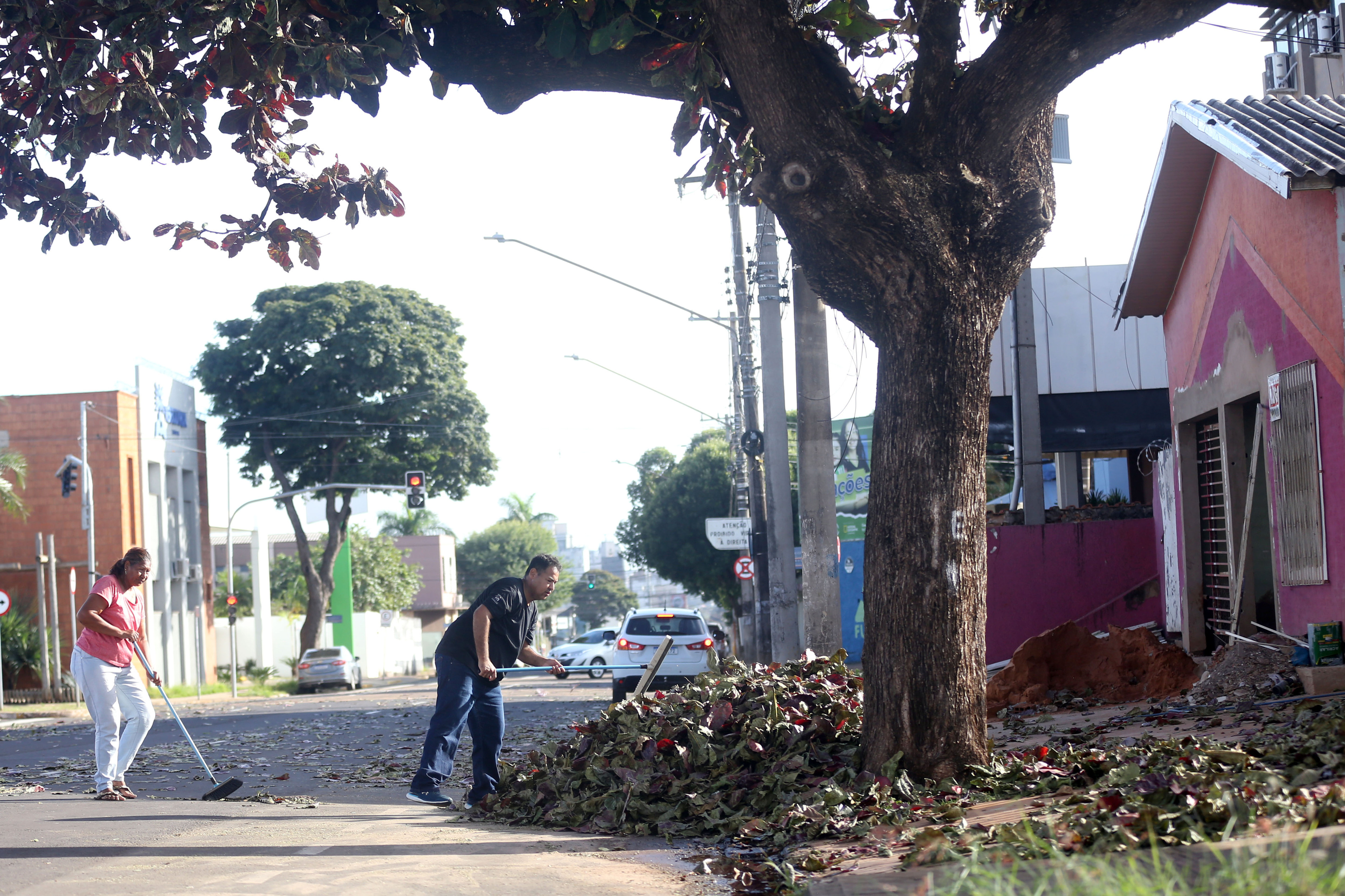 O auxiliar jurídico, Adriano Batista Benites, de 38 anos, junto a sua mãe, a autônoma Nair Batista Benites, de 60 anos, varriam as folhas, nesta manhã (23) em um trabalho que parecia sem fim, considerando que as folhas continuam caindo incessantemente.