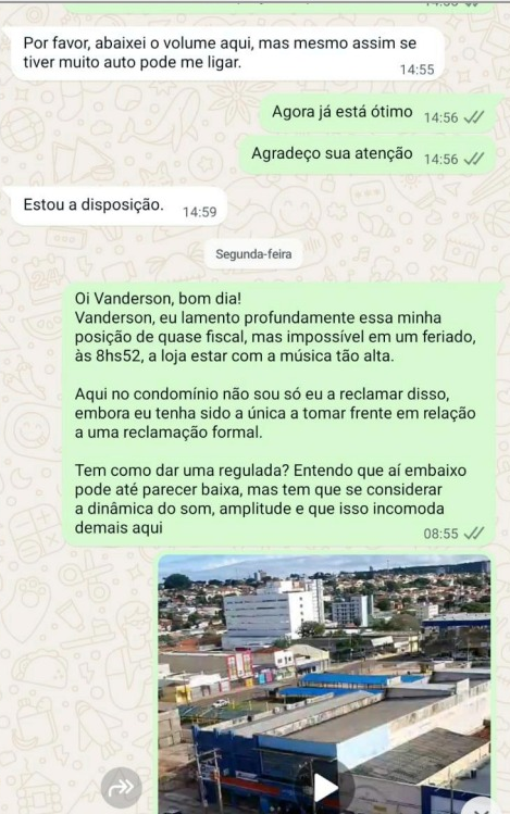 Conforme a mulher, os estabelecimentos funcionam das 9h às 18h30 com caixas de som voltadas para a rua e locutores nos fins de semana, emitindo som acima dos limites permitidos e causando transtornos a moradores de prédios vizinhos, especialmente pela ausência de isolamento acústico.