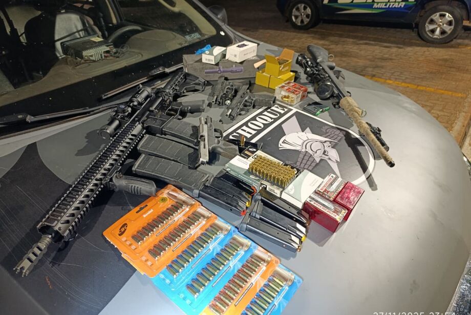 Entre as armas apreendidas estão uma pistola calibre .380 com três carregadores, uma pistola calibre 9mm com dois carregadores, e um fuzil calibre 5.56, equipado com uma luneta e carregadores.