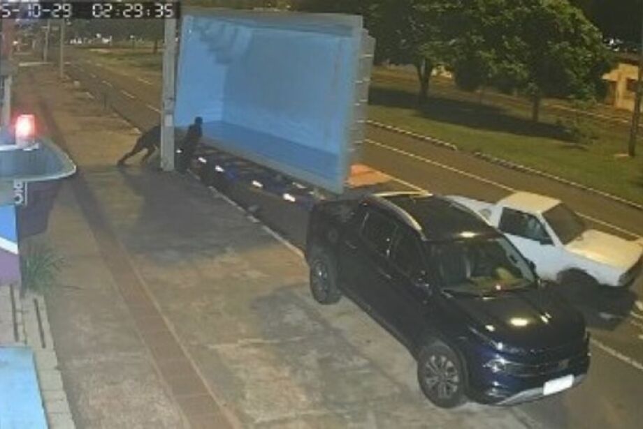 Na madrugada desta quarta-feira (29), câmeras de segurança flagraram três homens furtando uma piscina que estava na frente de uma loja, localizada na Avenida Afonso Pena, em Campo Grande.