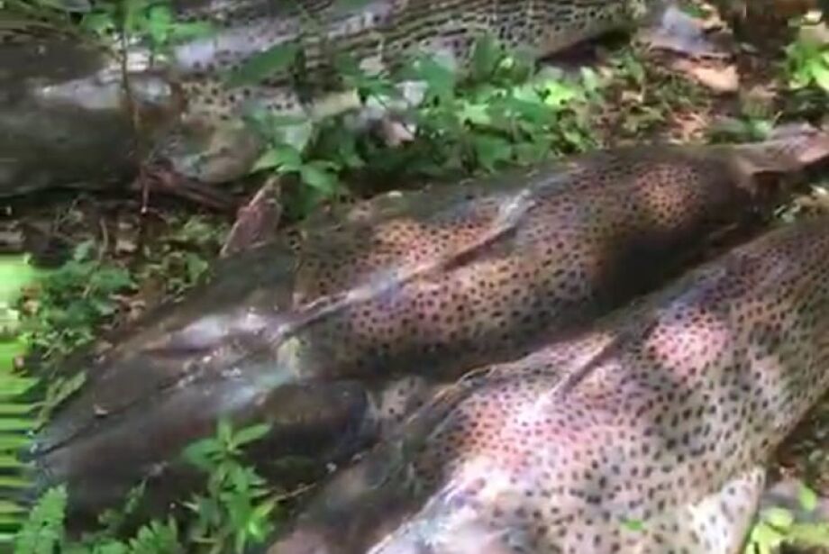 No vídeo, um dos peixes da espécie pintado aparece com um anzol de galho na boca (petrecho proibido), que fora utilizado na captura.