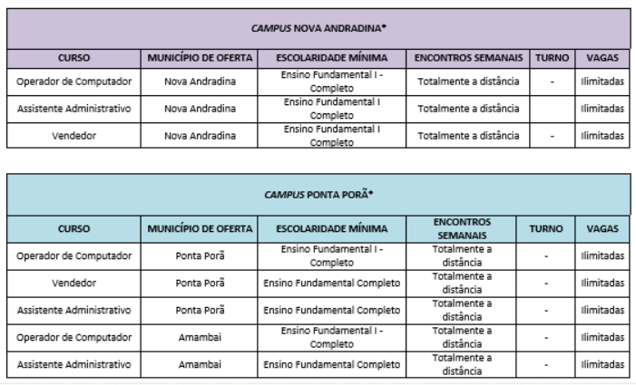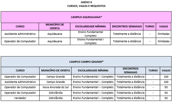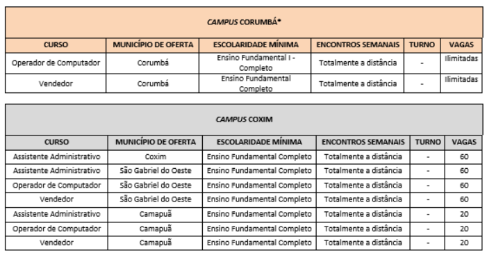 Os candidatos devem ficar atentos, pois a oferta varia de acordo com cada município. Para se matricular em alguns cursos, é necessário ter o ensino fundamental completo; em outros, basta ter concluído o ensino fundamental I (do 1º ao 5º ano).