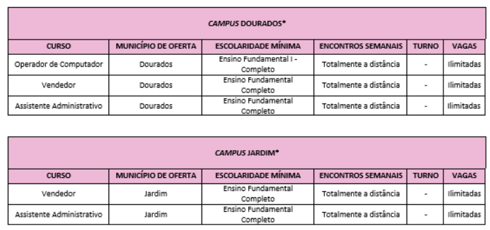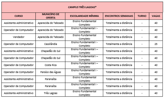 Em alguns cursos, as vagas são ilimitadas e estão distribuídas entre os 23 municípios de Mato Grosso do Sul. Os interessados têm até o dia 7 de setembro para se inscrever.