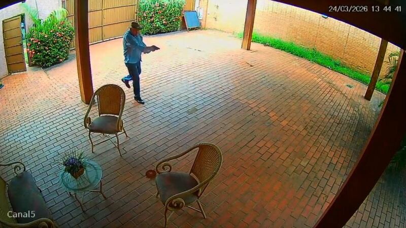 Após isso, é possível ver o chaveiro escapando e saindo da casa, às 13h45min10s.