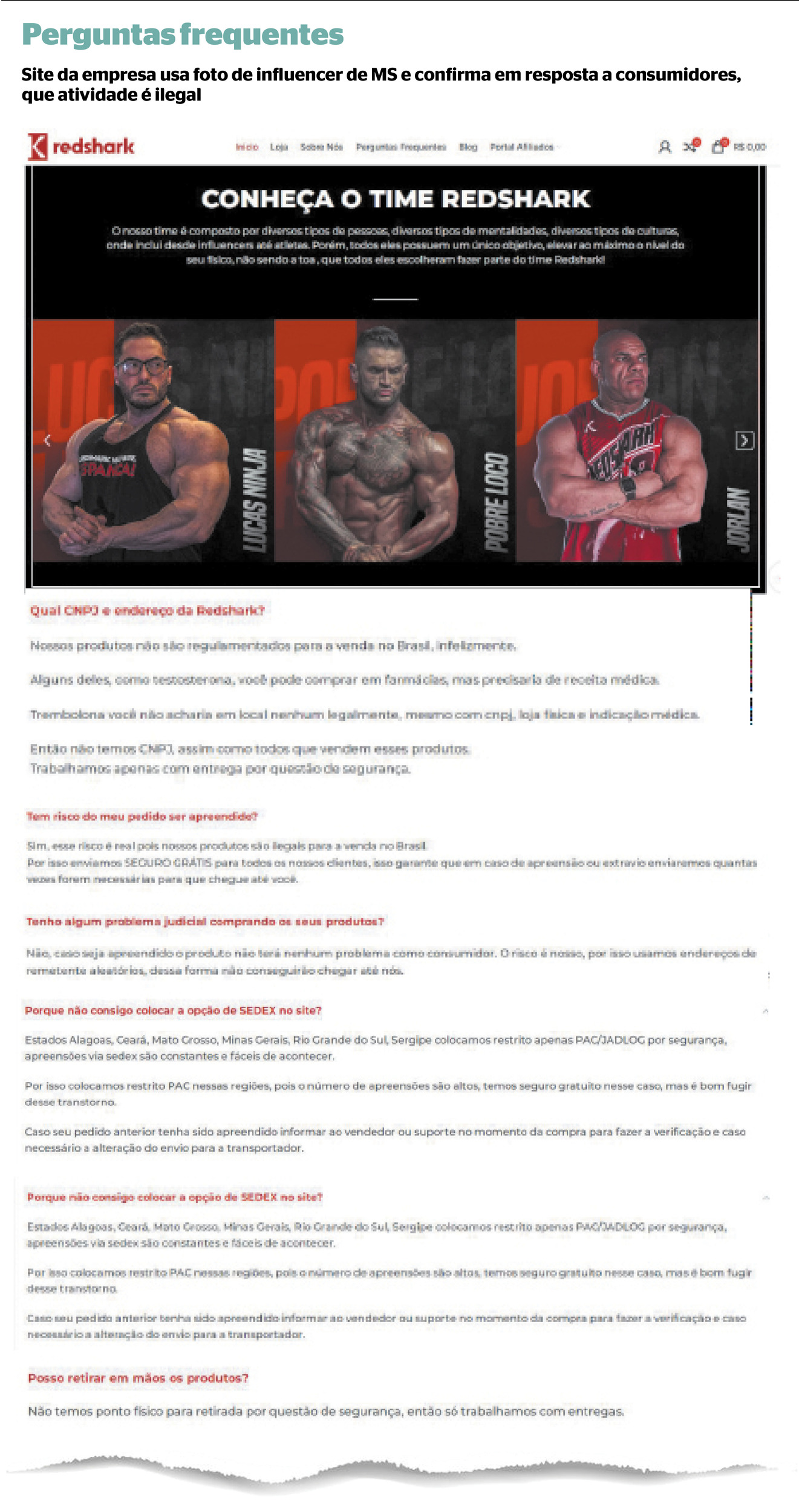 Na aba "Perguntas frequentes" no site oficial, a marca deixa explícito que os produtos não são regulamentados no Brasil e ainda destaca que "alguns deles, como testosterona, você pode comprar em farmácias, mas precisaria de receita médica", ou seja, confessando o crime.