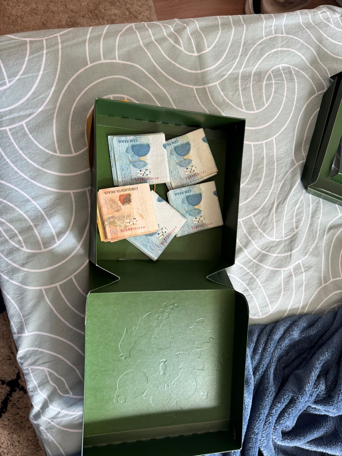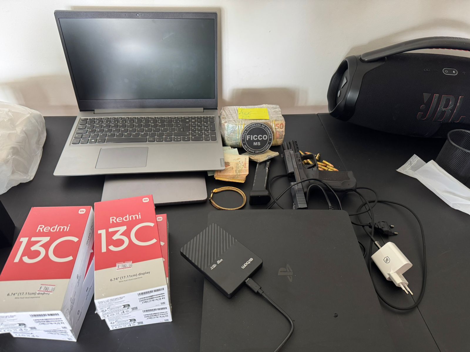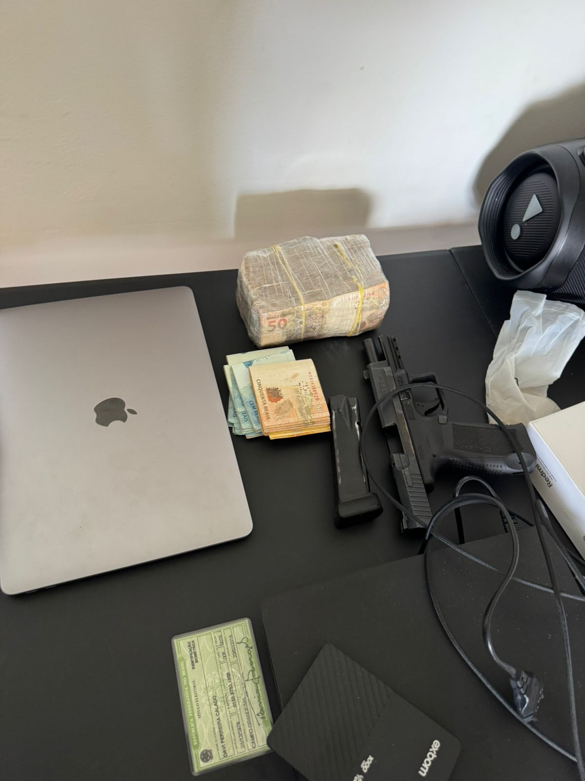 Durante as buscas no endereço do investigado, os policiais apreenderam grande quantidade de dinheiro em espécie, escondido dentro de uma embalagem, além de arma de fogo, munições, computadores, documentos e quatro celulares novos, que ainda estavam dentro da caixa.