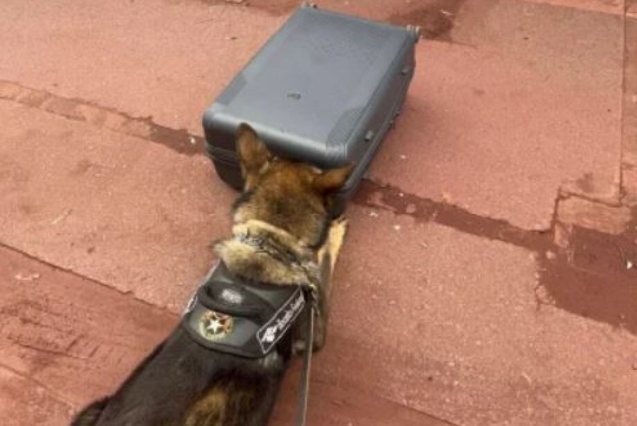 A droga foi localizada na bagagem da passageira com auxílio de um cão farejador durante fiscalização conjunta da Receita Federal e da Polícia Rodoviária Federal (PRF).
