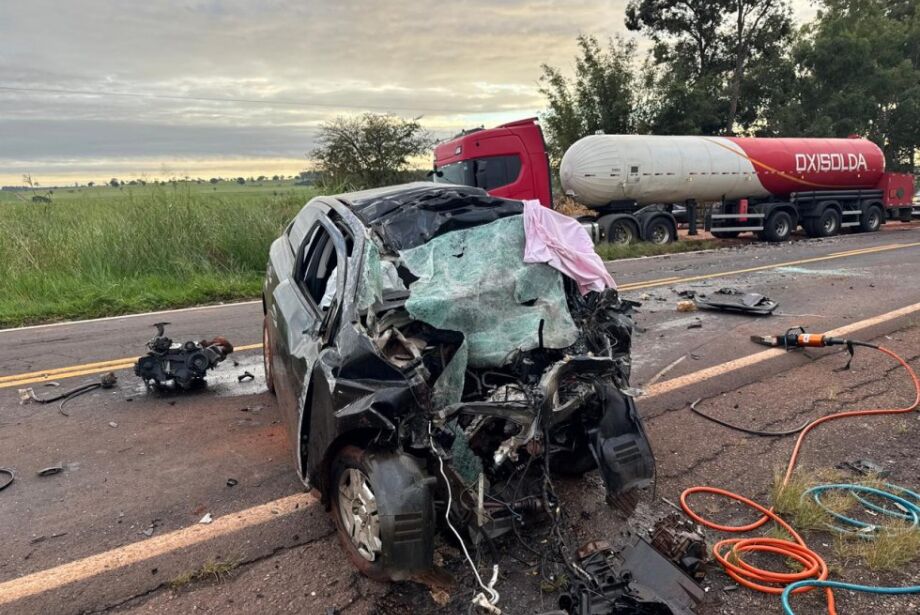 Batida entre caminhão-tanque e GM Ônix ocorreu entre Ivinhema e Deodápolis; vítima morreu presa às ferragens