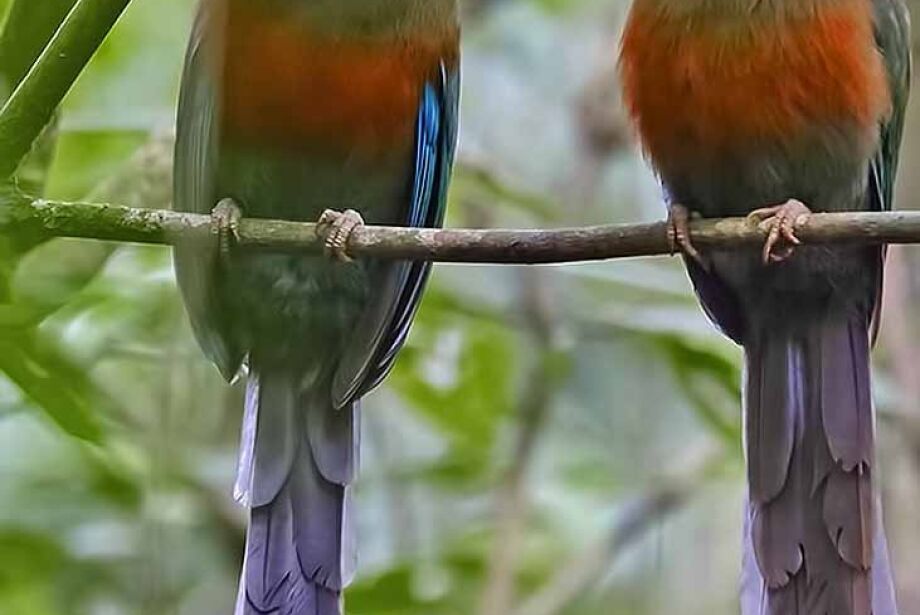 Com cerca de 42 centímetros, chama atenção pela plumagem marcante e colorida. Apresenta máscara negra, bico forte e preto, além de tons que vão do laranja ao verde e azul ao longo do corpo e da cauda. Apesar do visual exuberante, costuma permanecer no interior das matas, onde passa boa parte do tempo no solo, em busca de alimento.