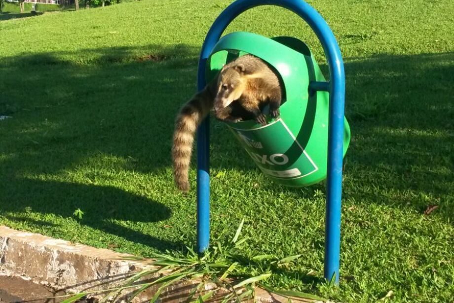 Um quati foi fotografado enquanto buscava alimento em uma das lixeiras da região do Parque dos Poderes em Campo Grande. O mamífero é visto com frequência naquela localidade porque existe uma  reserva ambiental de 135 hectares por lá: O Parque Estadual do Prosa.