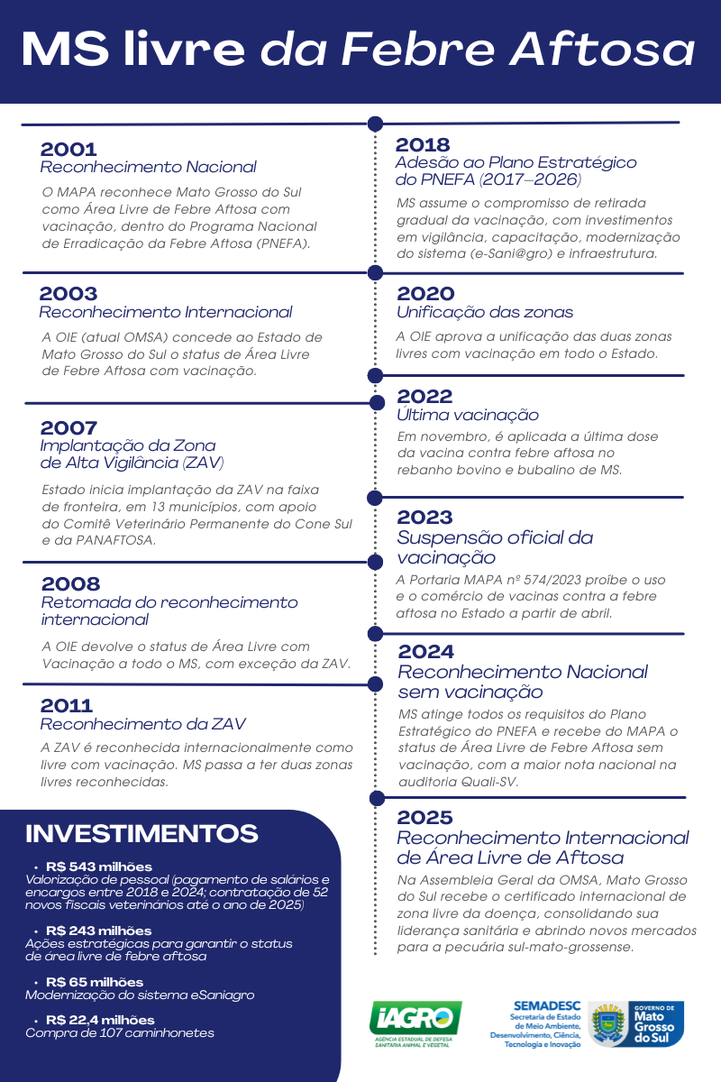 O Brasil iniciou as campanhas para erradicação da doença na década de 1960. Desde lá, o País foi avançando gradativamente tanto no controle da doença quanto na retirada de vacinação nos Estados até alcançar agora, em 2025, o status sanitário máximo. A erradicação da doença foi conquistada um ano antes do previsto no Plano Estratégico do Programa Nacional de Vigilância para a Febre Aftosa (PNEFA), lançado em 2017.
