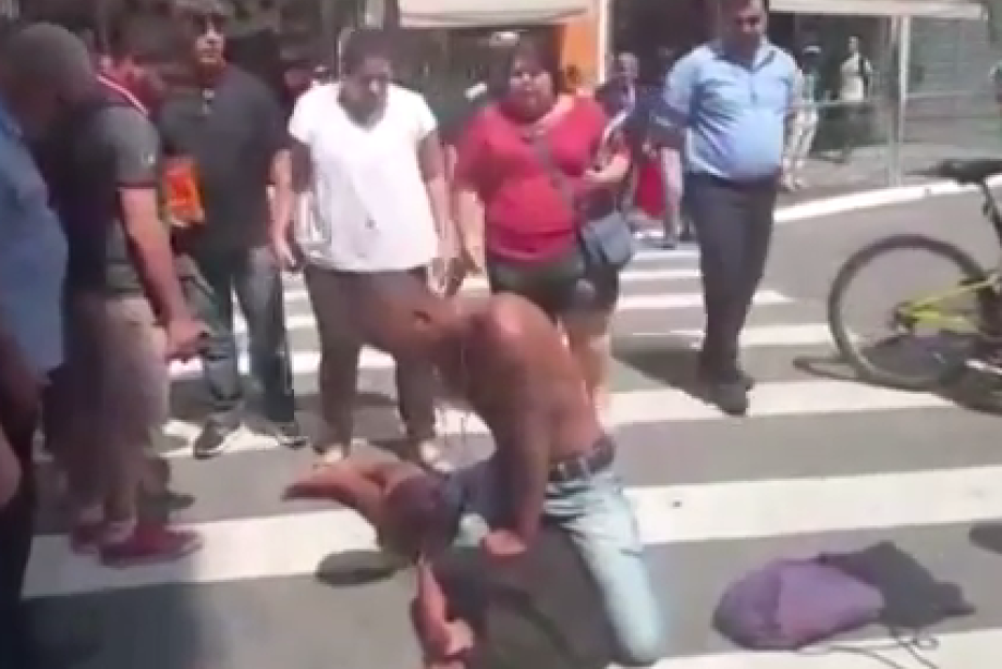 Passava das 15 horas na Rua Riachuelo, a 100 metros do Ministério Público (MP) de São Paulo, quando o trânsito parou. Todos queriam ver a cena. Nela, um lutador de MMA que trabalha em uma lanchonete do Centro da capital, imobilizava um outro homem em cima da faixa de pedestre. O repórter Walace Lara, da TV Globo, passava pelo local e flagrou a ação com exclusividade (assista abaixo).