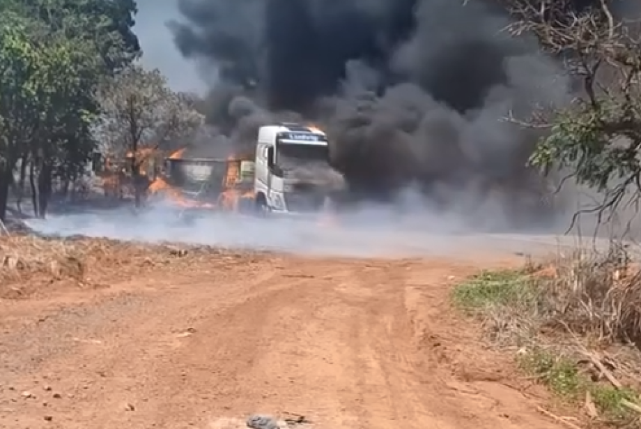 Uma carreta ficou totalmente destruída pelo fogo na tarde desta sexta-feira (24) e, devido à densa fumaça preta, o tráfego na BR-262 precisou ser obstruído entre os municípios de Ribas do Rio Pardo e Água Clara.
