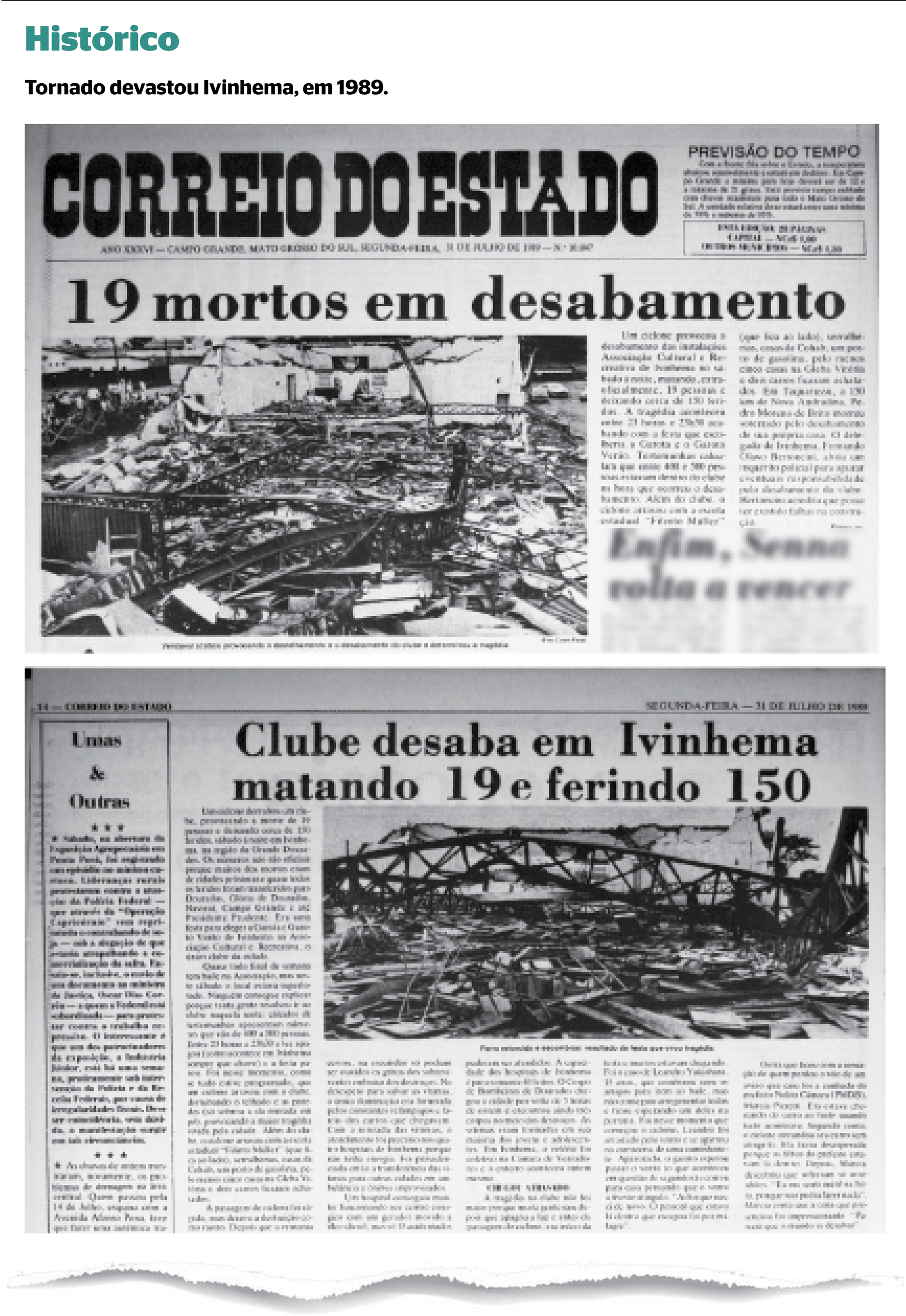 “Foi nesse momento, como se tudo estivesse programado, que um ciclone arrasou com o clube, derrubando o telhado e as paredes (só sobrou a da entrada em pé), provocando a maior tragédia vivida pela cidade”, detalhou a reportagem do Correio do Estado, que complementa que, além do clube, o tornado também atingiu uma escola, serralherias, casas e carros pelo caminho.