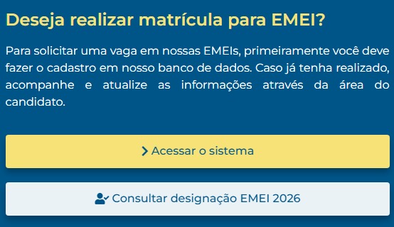 Nas EMEIs, para a educação infantil, é necessário fazer o cadastro no banco de dados da Semed e acompanhar as informações por meio da área do candidato, em que terá detalhes sobre as vagas disponíveis nas unidades escolares do município.