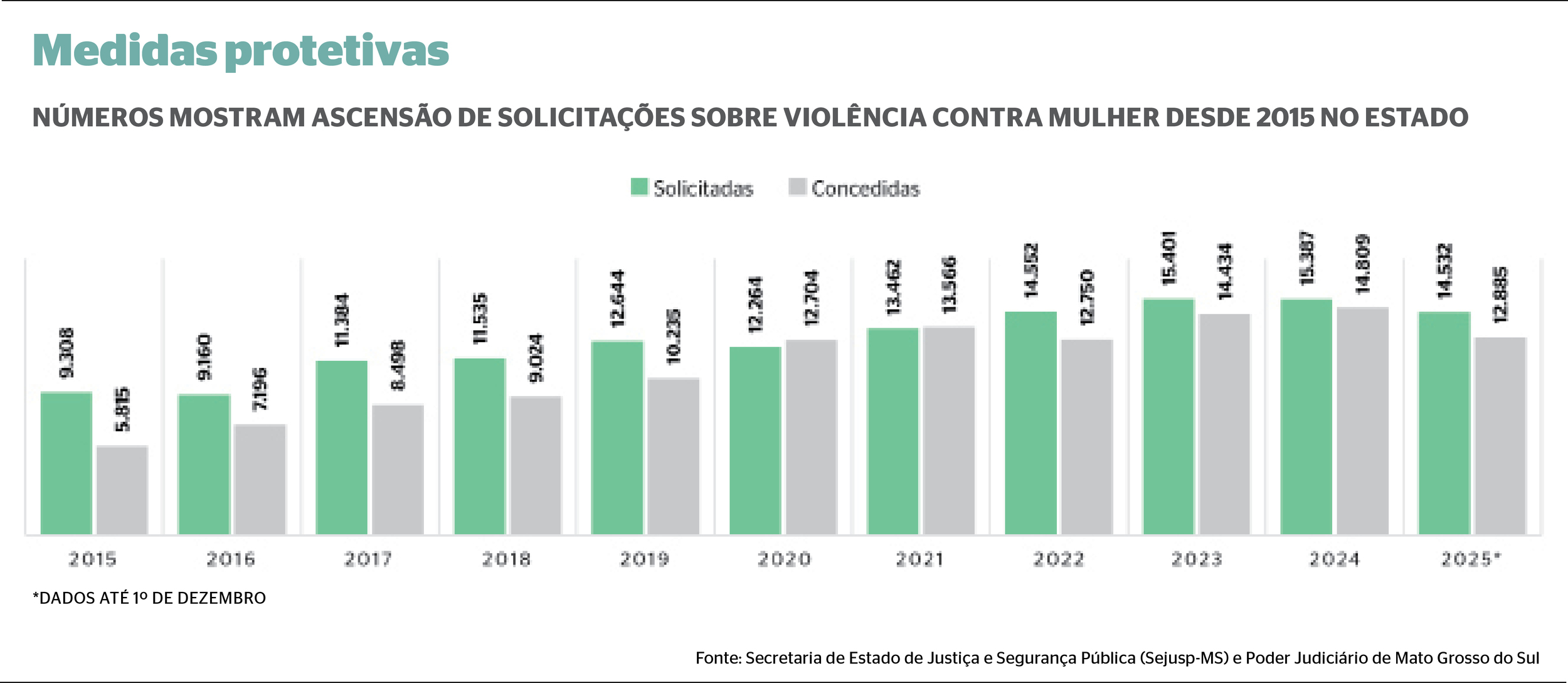 Conforme o Monitor da Violência contra a Mulher, disponibilizado pelo Poder Judiciário de Mato Grosso do Sul, foram solicitadas 14.532 medidas protetivas até o fim de novembro, das quais 12.885 foram concedidas, o que corresponde a 88,67% dos pedidos. Sobre o recorte mensal, a média de solicitações está na casa dos 1,3 mil.