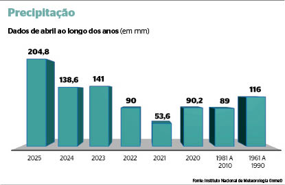 O dia de abril com maior volume de chuva foi 19/4, quando o Inmet registrou 71,4 mm. Cinco dias depois, em 25/4, sexta-feira passada, um grande volume de chuva foi registrado novamente, atingindo 54,4 mm.