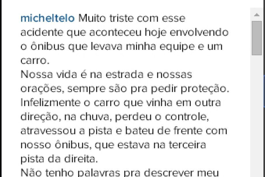 O cantor Michel Teló publicou há pouco em rede social sobre o acidente ocorrido neste domingo (10) entre o ônibus da equipe dele e um carro de passeio, na BR-376, no Paraná. Três pessoas que estavam no carro morreram e a equipe de Teló seguia para Campo Grande.