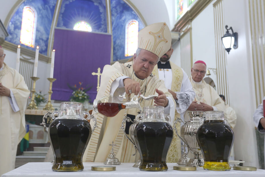 “É uma missa especial, nessa missa, nós, padres e bispos, renovamos os nossos compromissos sacerdotais. Na quinta-feira Santa, celebramos na igreja, justamente a instituição da Eucaristia, isso particularmente na missa da noite, mas também a instituição do sacerdócio católico. Então é um dia em que todos os padres são chamados, bispos, a fazer esse exercício de renovarmos os compromissos reforçados no dia da nossa ordenação. E além disso, abençoamos o óleo dos catecúmenos e o óleo dos enfermos, e consagramos o óleo do Crisma, que é usado não só no sacramento da Crisma, mas em muitas outras situações, inclusive nas ordenações dos padres e dos bispos. Graças a Deus, o nosso povo sente bastante a Semana Santa. Todos os cristãos são chamados a celebrar a vitória definitiva de Jesus sobre o pecado, a morte e a dor”, afirmou o arcebispo de Campo Grande, Dom Dimas, ao Correio do Estado.