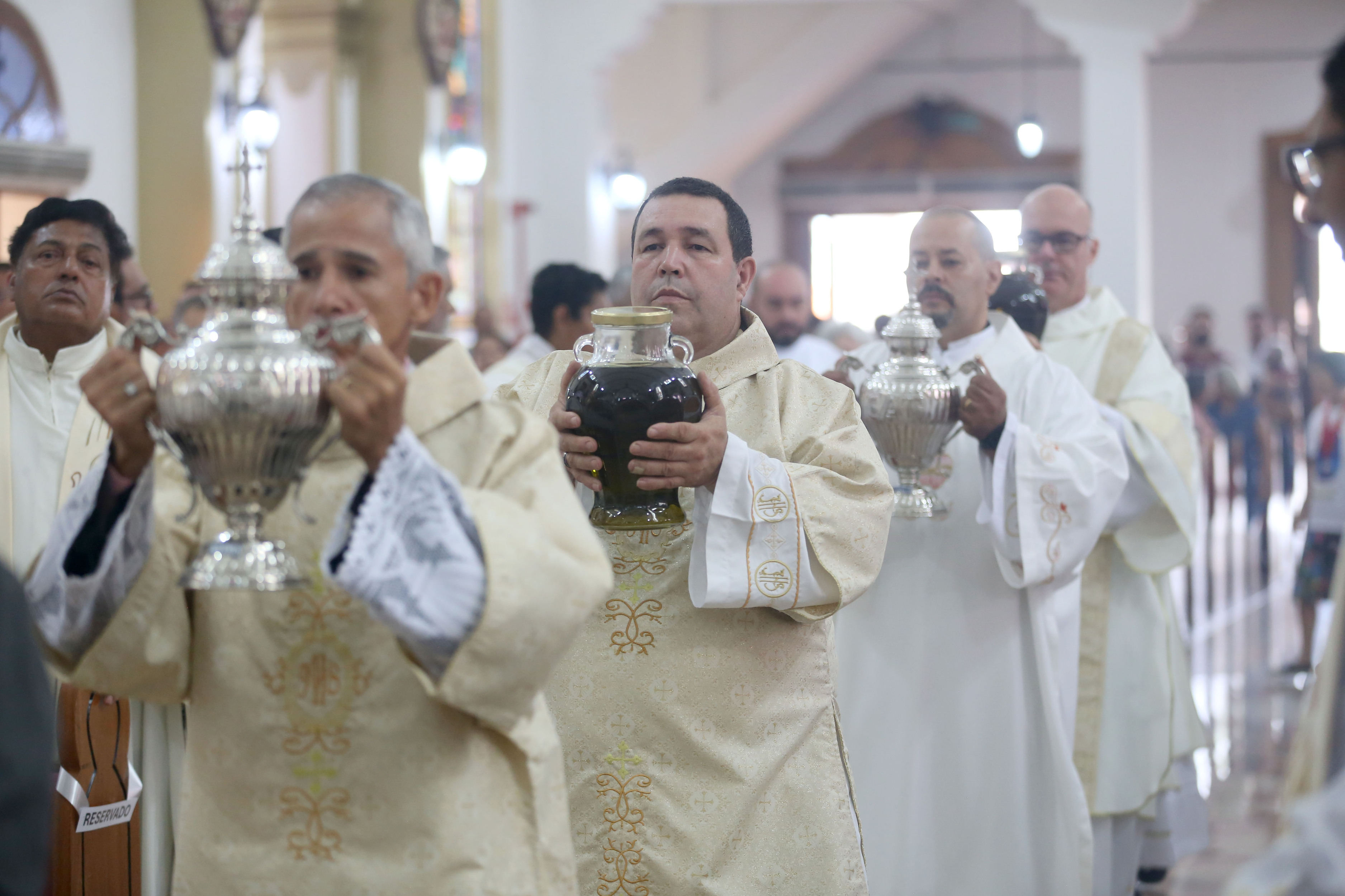 Missa dos Santos Óleos 2024, na Paróquia São José. Foto: Marcelo VictorMissa dos Santos Óleos é uma celebração litúrgica da Igreja Católica em que se abençoam os três óleos utilizados na administração dos sacramentos: o óleo do crisma, óleo dos catecúmenos e óleo dos enfermos.