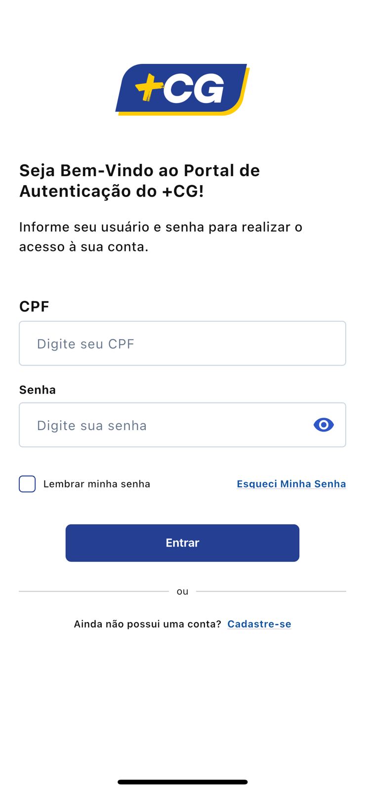 Após fazer o download do aplicativo, é preciso criar um cadastro, caso seja a primeira vez utilizando. Caso contrário, é só entrar na sua conta cadastrada, inserindo o CPF e senha.