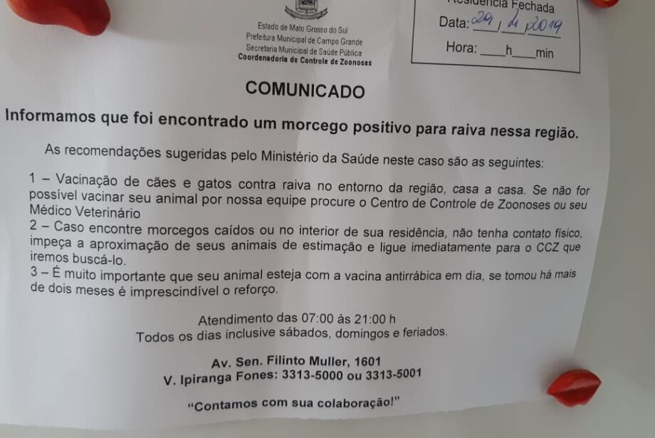 Do início do ano até agora três casos de raiva em morcego foram confirmados em Campo Grande. Um deles no bairro Vila Rosa Pires, outro na Vila Ipiranga e o último deles no Vilas Boas. Após esta confirmação, o Centro de Controle de Zoonoses vistoriou 996 imóveis na cidade.