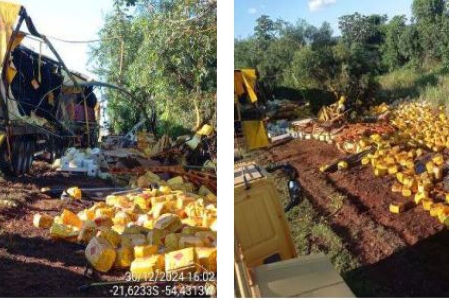 Uma carreta que transportava 1.980 galões de agrotóxicos (43,2 mil litros) tombou na altura do quilômetro 346 da BR-163, próximo ao distrito de Prudêncio Thomás, no município de Rio Brilhante. A investigação não aponta a causa do tombamento da carreta. Só informa que o motorista perdeu o controle da direção do veículo.