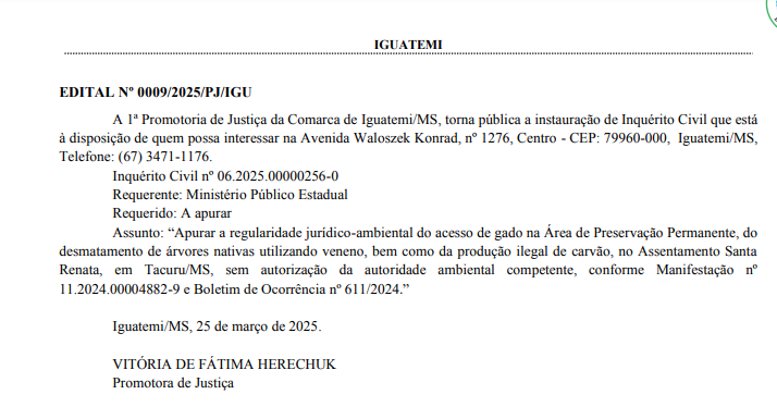 A 1ª Promotoria de Justiça de Iguatemi investiga a suspeita de ocorrência de crimes ambientais, como criação de gado em Área de Preservação Permanente (APP), uso de veneno para desmatamento de vegetação nativa e produção ilegal de carvão sem a devida licença ambiental.