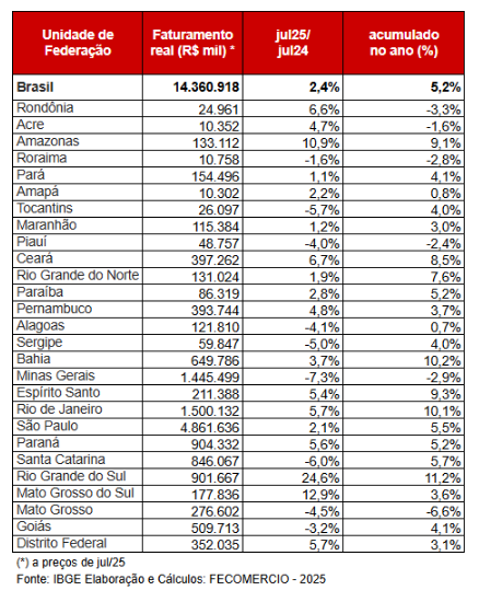 Além de Mato Grosso do Sul e Rio Grande do Sul, os estados com destaque para o mês foram Amazonas (10,9%) e Ceará (6,7%). São Paulo teve o maior mercado em valores absolutos, movimentando em torno de R$4,86 bilhões, registrando uma alta de 2,1%.
