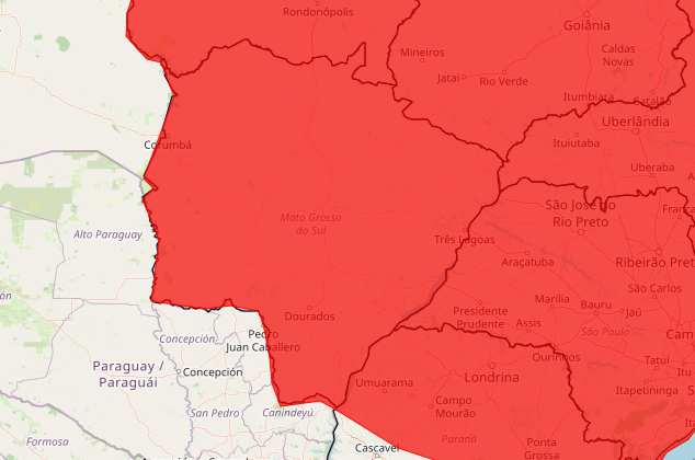 Mato Grosso do Sul está no centro da Onda de Calor. Divulgação/InmetAlerta vermelho do Instituto Nacional de Meteorologia (Inmet) indica que a temperatura está 5ºC acima da média entre segunda-feira (13) e sexta-feira (17), em todos os 79 municípios de Mato Grosso do Sul. O aviso aponta grande perigo, com risco à saúde.