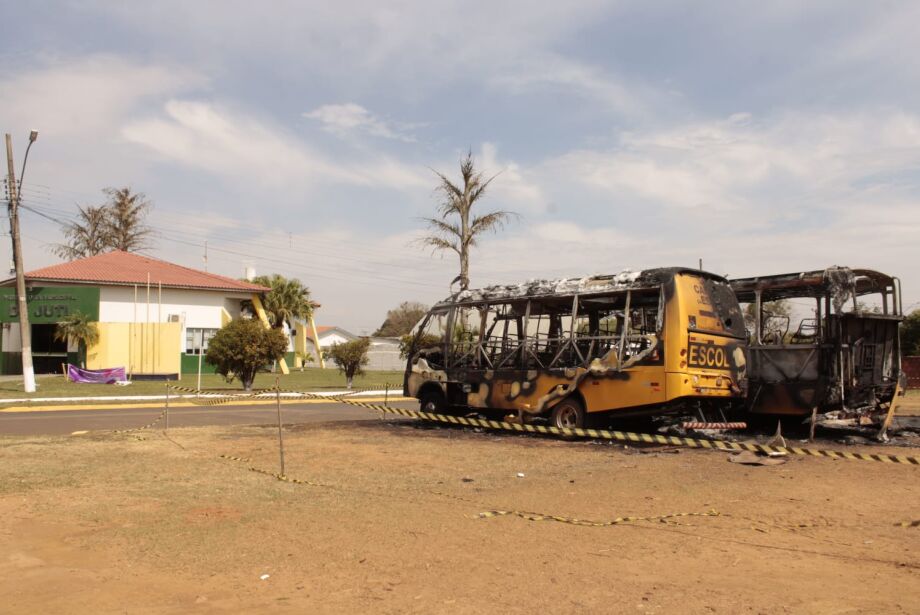 Dois ônibus escolares foram incendiados na madrugada deste sábado (23), em frente ao Paço Municipal de Juti, município localizado a 310 quilômetros de Campo Grande.