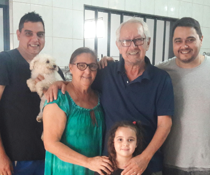 Da esquerda para a direita: Bruno segurando a cachorrinha Belinha, Ires, Adalberto, a netinha Louise, e Renato / Reprodução Redes SociaisFamília Unida em Deus