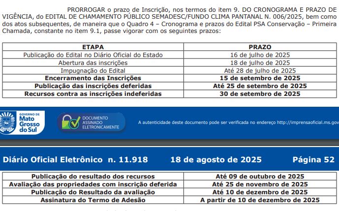 As inscrições ao Programa de Pagamento por Serviços Ambientais do Pantanal (PSA Pantanal), previstas para acabarem nesta quarta-feira (20), foram prorrogadas até 15 de setembro, conforme publicação da Semadesc (Secretaria de Meio Ambiente, Desenvolvimento, Ciência, Tecnologia e Inovação) na edição desta segunda-feira (18) do Diário Oficial do Estado.