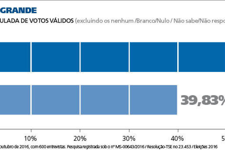 A última pesquisa do Ipems do segundo turno, concluída no fim da tarde de ontem, aponta a vitória do candidato Marquinhos Trad (PSD) a prefeito de Campo Grande, na eleição de hoje, por 60,17% das intenções dos votos válidos (quando são excluídos brancos, nulos, indecisos, não respondeu e nenhum dos concorrentes). A sua rival, Rose Modesto (PSDB), ficaria com 39,83%. A vantagem de Marquinhos seria de 20,34 pontos porcentuais.