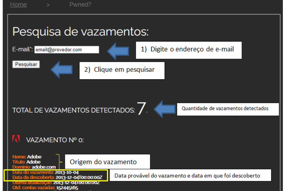 O sistema aponta a quantidade de vazamentos, sites e datas em que eles ocorreram. A detecção significa que pessoas mal-intencionadas pode ter acesso a senha utilizada para acessar o e-mail informado e utilizá-la para tentar acesso a outros serviços que tenham a mesma senha.