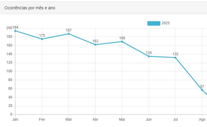 Em 2025, de janeiro a agosto, o Estado registrou 1.211 vítimas de estupro. O mês com maior índice de incidência desse crime foi março, que teve 187 vítimas.