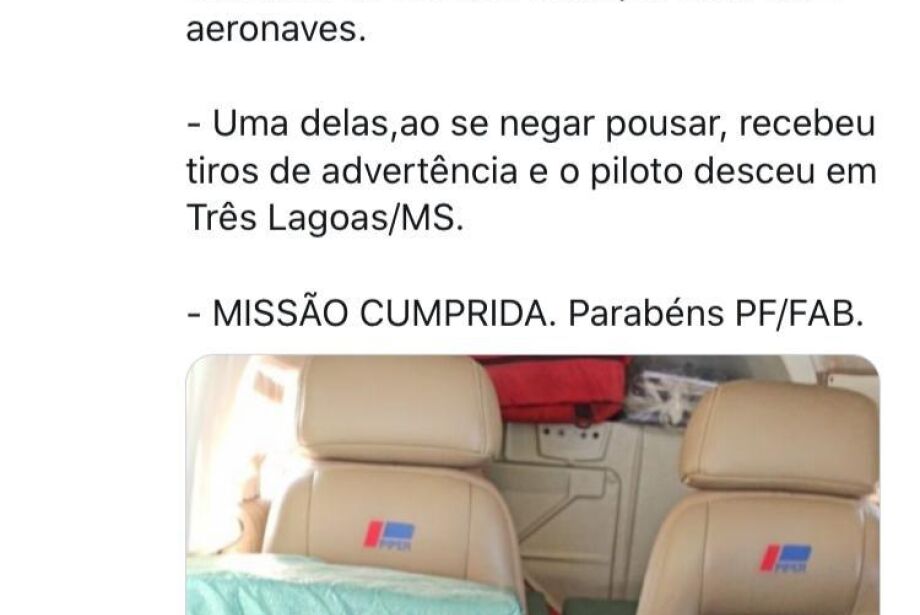 Foi realizada escolta do avião, que parou já fora de Mato Grosso do Sul. O pouso aconteceu em Rondonópolis (MT), onde a Polícia Federal assumiu a ações, prendendo duas pessoas - piloto e copiloto - e apreendeu 450 kg de cocaína.