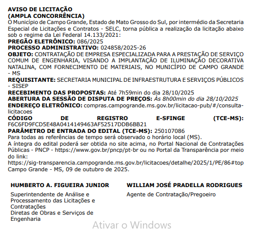 O aviso de licitação foi publicado nesta sexta-feira (10) na página 19 do Diário Oficial de Campo Grande (Diogrande). Veja o trecho redigido: